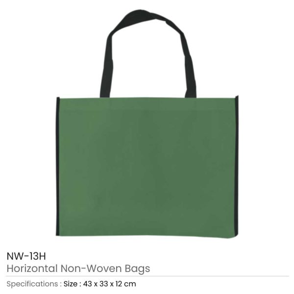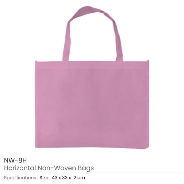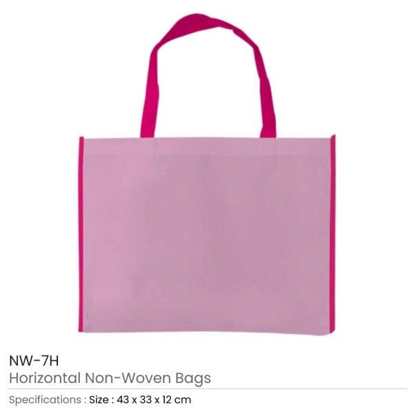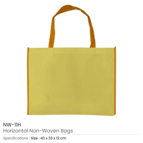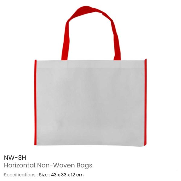 Horizontal non-woven bags are biodegradable two-color bags. These bags have a simple yet elegant structure. These bags had manufactured using non-woven material. It means they are neither woven nor knitted. However, they had made from flat porous biodegradable sheets. These sheets had made of staple and long fibers. Thus, these SAWG bags are more durable than other bags. It comprises a horizontal white color surface with a colorful outline. However, the handle is colorful. They have more strength than other bags. Thus, they can carry more weight. Also, these branded bags are easily washable.
