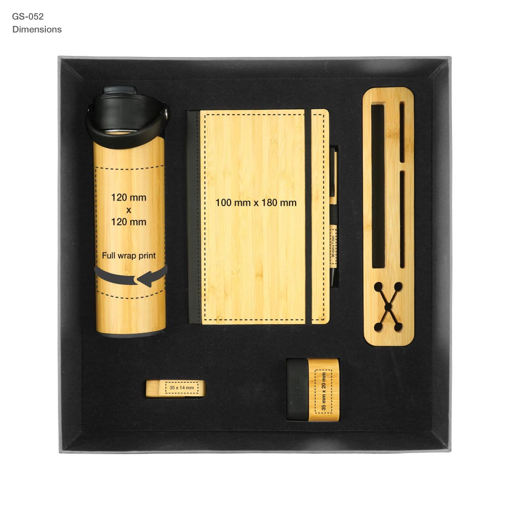 Enclosed within a black cardboard gift box, these components comprise a unified and visually appealing promotional gift set. The emphasis on incorporating bamboo into products such as notebooks, pens, bottles, and speakers underscores a dedication to promoting sustainability and embracing natural aesthetics. This set is especially appropriate for firms seeking to cultivate an environmentally conscious reputation or for events centered around sustainability and innovation. The incorporation of conventional products alongside contemporary technological accessories guarantees a wide range of attractiveness, rendering the set appropriate for corporate occasions, client presents, or inclusion in an employee recognition initiative. The functionality and visual attractiveness of each item guarantee its use and admiration, ensuring the brand remains prominent in the minds of recipients.