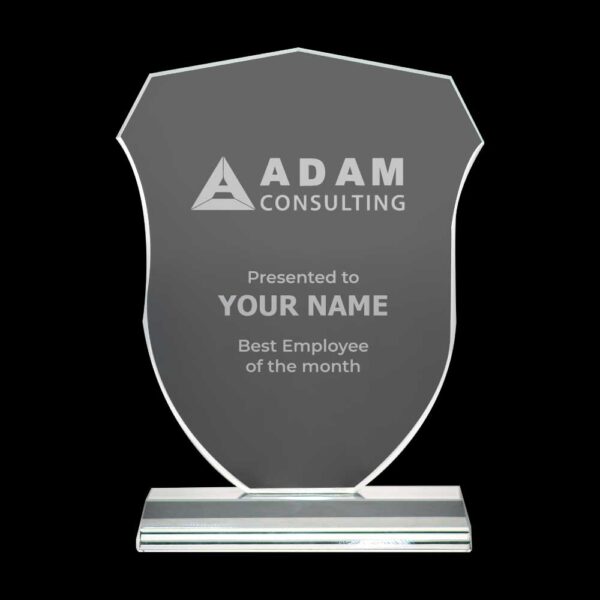 Shield Shaped Crystal awards with glass base packed in the black carton gift box.